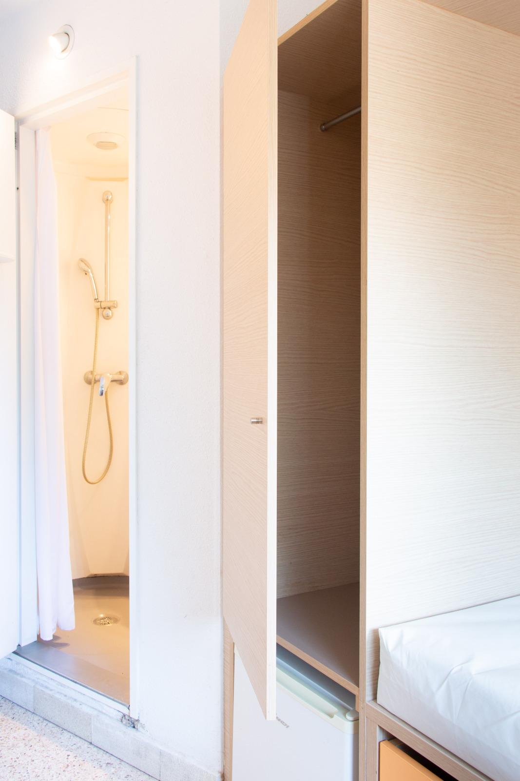 Equipement : cuisine collective, réfrigérateur | Sanitaires : lavabo, douche, WC | Mobilier : lit une place, bureau, table, chaise ou tabouret, placard | Installations : accès internet filaire inclus
